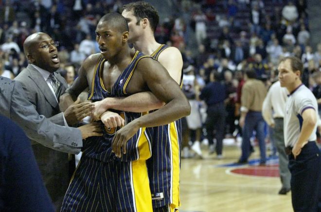 第四位:本・华莱士——“沉默的凶兽”,一言不发就动手,奥本山宫事件的“导火索”本・华莱士平时沉默寡言,看起来像个“老实人”——他从不用垃圾话挑衅对手,也不喜欢在镜头前表现自己,只会用篮板和盖帽证明自己。可谁要是以为他“好欺负”,那就大错特错了——一旦被激怒,他就会变成“沉默的凶兽”,用拳头解决问题,连阿泰斯特都敢怼。2004年奥本山宫事件,正是由本・华莱士的“一推”引发。当时比赛临近结束,阿泰斯特对本・华莱士犯规动作过大,本・华莱士瞬间暴怒,一把将阿泰斯特推到数米开外。要知道,本・华莱士身高2.06米,体重118公斤,爆发力极强,这一推差点让阿泰斯特摔倒。也正是这一推,点燃了后续的“观众席混战”——阿泰斯特被激怒后冲进观众席,引发大规模冲突。除了奥本山宫事件,本・华莱士在赛场上也多次“失控”:他曾因对手故意犯规,直接冲上去与对手推搡;也曾因裁判判罚不公,怒摔毛巾、踢翻饮水机。可他的“暴脾气”从不针对队友,反而很护短——当年活塞队友被对手欺负时,本・华莱士总会第一个站出来“撑腰”。活塞队友回忆:“华莱士平时话不多,但只要你是他队友,他就会保护你;要是你是他对手,就别轻易惹他。”