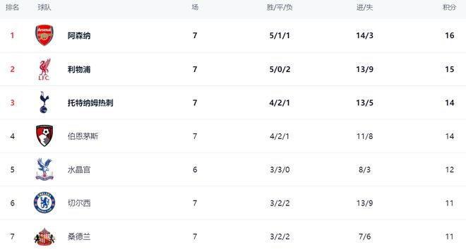 在积分榜上,赢球的阿森纳登上了榜首位置。阿森纳5胜1平1负,拿到了16分。利物浦这轮落败,依然是15分,排名第2。热刺以14分排名第3。伯恩茅斯这匹黑马也是14分,排名第4。水晶宫以12分排名第5。切尔西和桑德兰都是11分。曼城和曼联则都是10分。