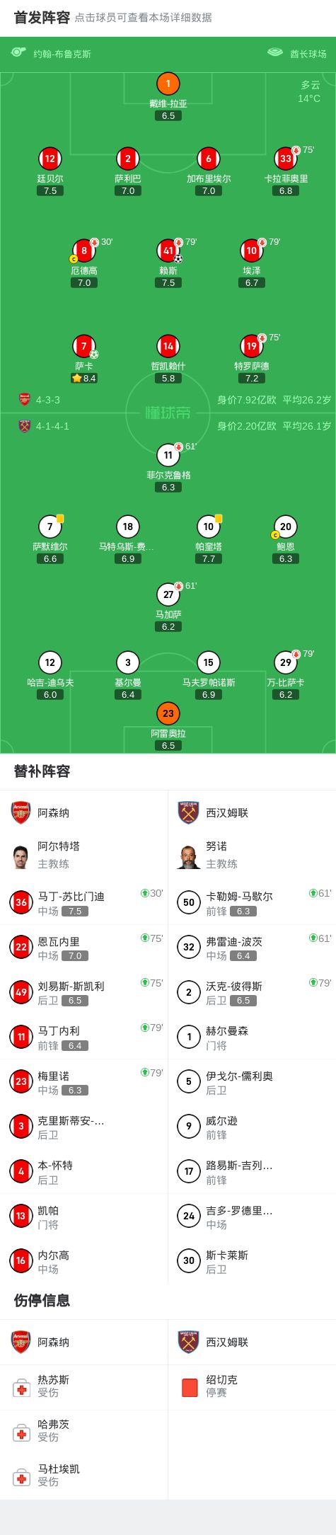 北京时间10月4日,英格兰足球超级联赛第7轮,阿森纳坐镇主场迎战西汉姆联。上半场厄德高伤退,萨卡破门被吹,赖斯补射破门,下半场廷贝尔造点,萨卡点射锁定胜局。最终阿森纳以2-0战胜西汉姆联,全取三分。关键事件第38分钟,赖斯禁区内推射破旧主,随后选择不庆祝,阿森纳1-0西汉姆联