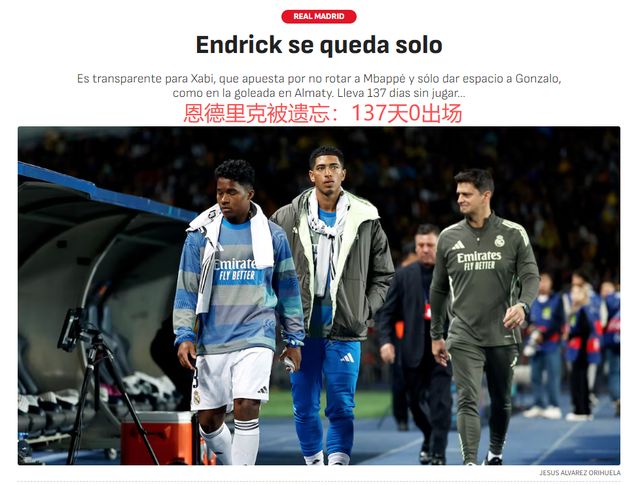 莫德里奇离开皇马之后,姆巴佩接过10号战袍,恩德里克则穿上姆巴佩留下的9号。不过,皇马9号却是边缘人:2025-26赛季,恩德里克出场0分钟。《阿斯报》指出,恩德里克上次代表皇马出场,还是5月18日的西甲客战塞维利亚,距今已有137天。从目前的情况来看,恩德里克很难获得机会。