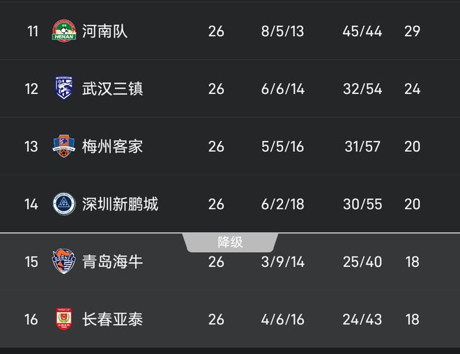 中超保级区最新形势:梅州、新鹏城20分,海牛、亚泰18分