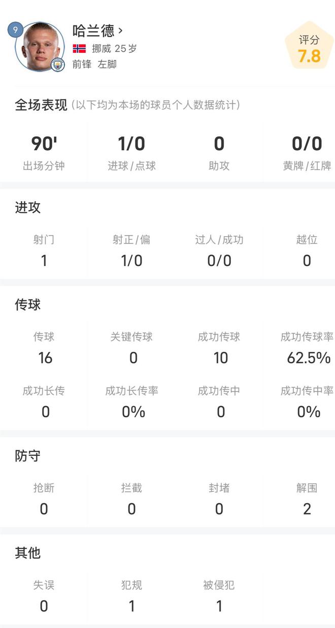 打入全场唯一进球,哈兰德当选曼城10布伦特福德全场最佳