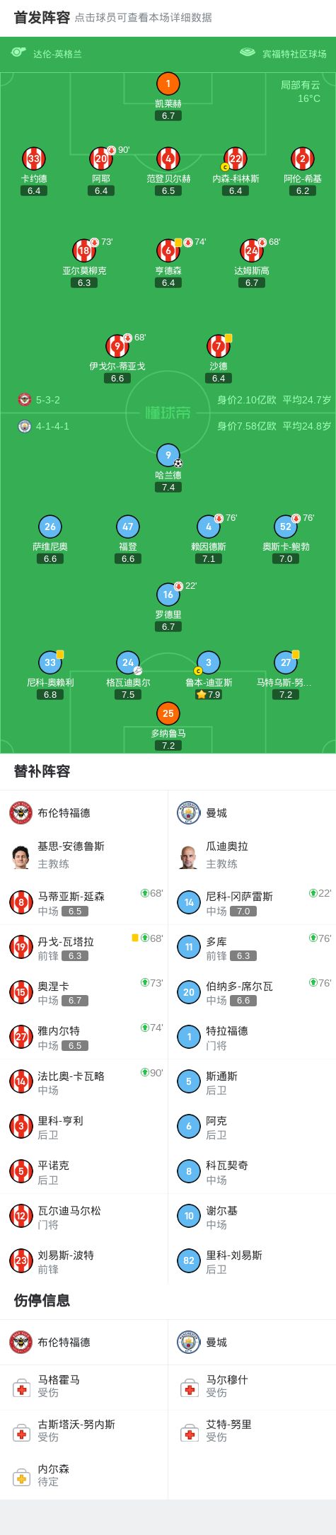 剑南春曼城10客胜布伦特福德,哈兰德制胜,罗德里伤退