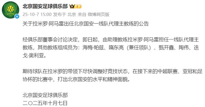 - 中超 | 关于拉米罗阿马雷出任北京国安一线队代理主教练的公告