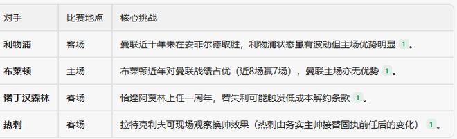 曼联在英超7轮后积10分排名第10位,低于升班马桑德兰的排名,主帅阿莫林也一度高居英超主帅下课赔率榜首。拉特克利夫在投资曼联时明确表示,球队优先追求竞技成绩而非商业收益,此时提及“三年证明期”,更像是一种委婉的最后通牒。当然,更现实的威胁是来自俱乐部的合同条款。据报道,若曼联在阿莫林任职满一年后解雇他,赔偿金将大幅降低。这一时间点恰逢接下来曼联对阵诺丁汉森林的比赛日。在拉特克利夫力图将曼联打造为“最盈利的足球俱乐部”的背景下,球队的每一笔开支都需精打细算,阿莫林的去留很可能取决于经济成本而非单纯战绩。在国际比赛日后,阿莫林面临的真正考验是接下来的残酷赛程(见表)。