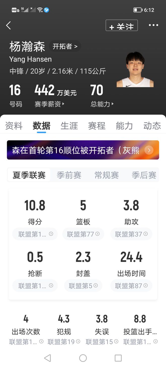 夏联阶段,他场均可出场27.1分钟,场均据是14分11篮板2.3助攻1盖帽,投篮命中率43.8%,三分命中率50%。