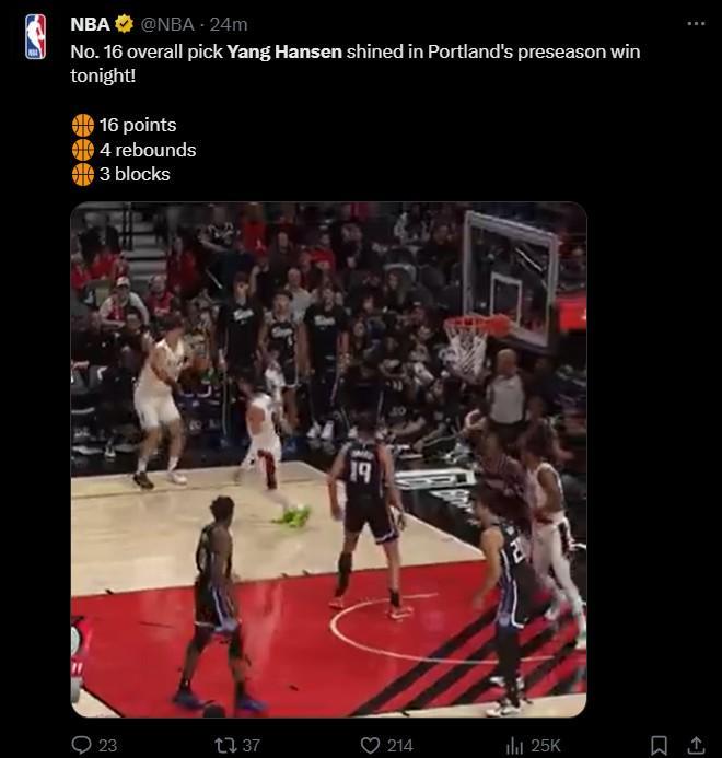 杨瀚森在第三节中打出进攻高潮,单节得到14分2篮板1助攻1盖帽,这样的表现也得到了NBA官方的认可。NBA官方社媒在赛后第一时间发布了杨瀚森的视频集锦,并配文写道:“16号秀杨瀚森今晚在开拓者季前赛的胜利中大放异彩!”