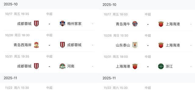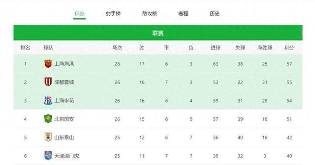 中超第26轮后的积分榜。此外,海港队多名防守主将身背三张黄牌,时刻可能拉响累积四张黄牌停赛的警告。门将颜骏凌在多次关键战役变身对手进攻的叹息之墙,屡屡神勇扑救,但目前身背三张黄牌;后卫蒋光太是海港防守端的定海神针,有他和没他的海港后卫线完全是两种质量、两个节奏。此外,作为海港隐形攻防核心的外援茹萨,目前已经累积吃到10张黄牌 —— 之前已连续两次累积黄牌后停赛,如今又有 2 黄在身。茹萨缺席的海港队,曾在成都客场以 1 比 4 输给争冠竞争对手蓉城队。显然,不管是蒋光太、颜骏凌还是茹萨,三名防守端的核心球员一旦累积黄牌停赛,或直接影响海港冲击冠军的发展走势。主帅玩谋略,低调务实或才有出路成都蓉城与上海申花虽积分暂时落后,但均手握冲击冠军的关键筹码。蓉城以 55 分紧追海港,更凭借对海港的双杀战绩占据同分情况下的优势,其 “每场当决赛踢” 的务实作风,让这支以稳固防守崛起的球队成为最大变数。不过补时被浙江队绝平的经历,暴露了球队防守注意力不集中的致命问题,剩余赛程中对阵状态正佳的河南队,将是对其稳定性的终极考验。