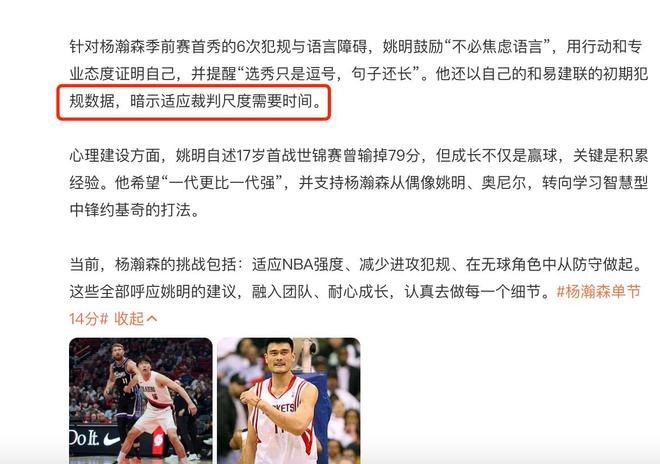 在前段时间的采访中,姚明也曾经提醒过杨瀚森,他列举了自己和易建联当初刚刚进入NBA发展时候的一些犯规次数,以此来提醒杨瀚森要适应裁判的尺度确实需要时间,同时年轻球员确实会更容易被吹罚。所以对于杨瀚森来说,既然已经决定闯荡NBA,你得适应那里的规则。只能够不断的调整自己,做得更好。也有些球迷质疑,之前不管是杨瀚森还是其他的国内球员,其实在国内联赛的时候,有些犯规的动作确实做得有些过分,对抗的尺度也有些大,才会导致我们很多国内球员到国外比赛的时候频频踩坑,容易出现过度对抗的行为。