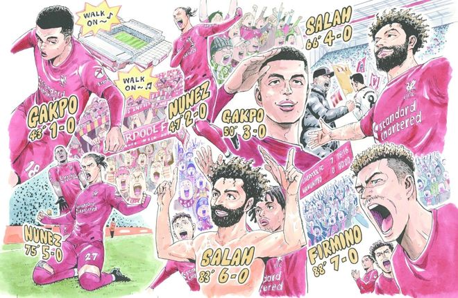 雷速体育10月18日讯 在本周末英超双红会前,利物浦官网刊登了一张日本讲谈社创作的利物浦7-0大胜曼联的漫画作品。讲谈社正式发布了一幅特别漫画作品,定格了利物浦队史对阵曼联的最大比分胜利瞬间。2023年3月,在英超联赛的一场较量中,利物浦在安菲尔德球场以7-0的悬殊比分击败死敌曼联,震惊足坛。如今,日本漫画家辻智(代表作《逆转监督》)以全新的漫画形式,重现了那个难忘的赛场时刻。作为创作筹备与调研的重要环节,辻智在利物浦足球俱乐部官方出版合作伙伴讲谈社的陪同下,曾亲自到访默西塞德郡及安菲尔德球场。在创作过程中,他深受“利物浦俱乐部将球员、工作人员、球迷与球场紧密凝聚成一体的氛围”所触动,并表示俱乐部展现出的激情与凝聚力是“极具感染力的创作灵感源泉”。这幅利物浦主题漫画作品的公开恰逢本周末红军将在安菲尔德球场再度迎战曼联、续写两队的百年宿敌恩怨之际。“漫画与足球都能为生活增添色彩,让人生更富活力。”辻智这样说道。他的作品以欢腾的安菲尔德球场为背景,生动刻画了利物浦队七个进球的庆祝瞬间。这幅独特的漫画作品将在利物浦主场即将全新开放的“讲谈社二号专区”展出,届时球迷们将有机会近距离欣赏。