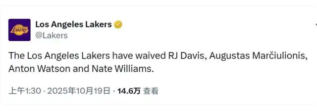 常规赛倒计时最后一天,湖人再度官宣消息:先后裁掉奥古斯塔斯·马尔丘利奥尼斯、RJ·戴维斯、内特·威廉姆斯、安东·沃森四人。