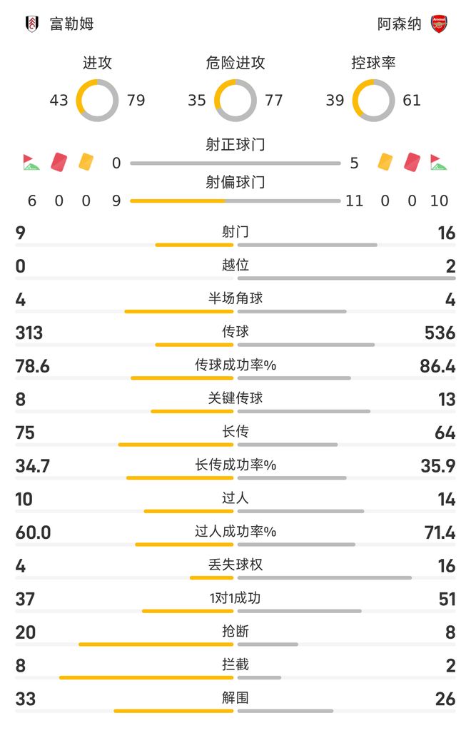 阿森纳10富勒姆全场数据:射正次数50,控球率超6成