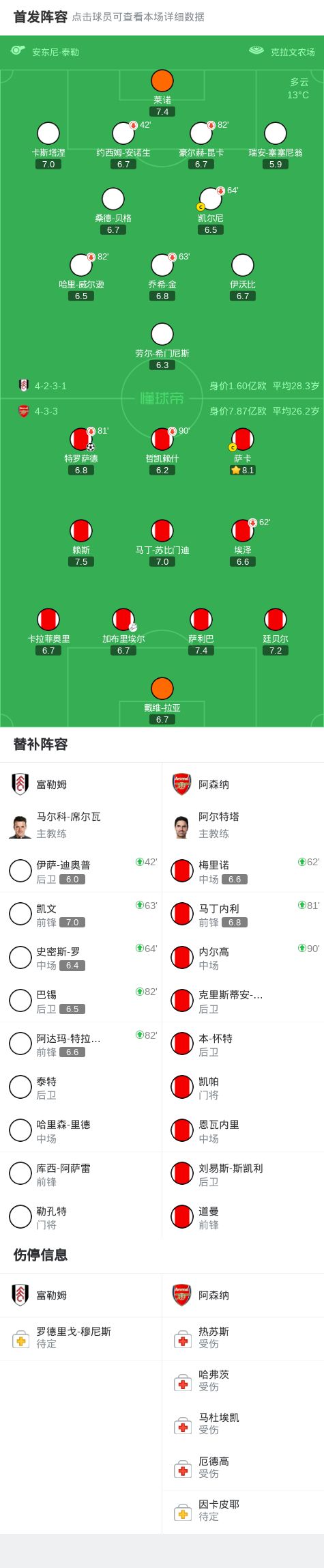北京时间10月19日,英格兰足球超级联赛第8轮,富勒姆坐镇主场迎战阿森纳。下半场萨卡开出角球,加布里埃尔前点一蹭,特罗萨德破门。凭借此粒进球,阿森纳客场1-0战胜富勒姆,全取三分。关键事件第59分钟,萨卡开出角球,加布里埃尔前点一蹭,特罗萨德破门,阿森纳1-0独家看英超就在咪咕精彩瞬间双方球员入场,比赛马上开始第10分钟,劳尔-希门尼斯前插后射门,球被拉亚扑出第15分钟,卡拉菲奥里破门,但越位在先,进球无效第25分钟,威尔逊禁区前射门,球打偏了第30分钟,乔希-金的边路传中球直奔球门,球被拉亚托出底线第36分钟,哲凯赖什小角度射门,球被莱诺扑出第37分钟,卡拉菲奥里禁区内抽射,球稍稍高出第40分钟,乔希-金被队友劳尔-希门尼斯误伤,裁判吹停,队医进场治疗第42分钟,富勒姆换人,安诺生伤退,迪奥普登场第49分钟,萨卡突入禁区传球制造混乱,球最后被解围第56分钟,哲凯赖什禁区内倒地,裁判没有表示第64分钟,萨卡禁区内过人后射门,球被莱诺扑出第68分钟,萨卡造点,VAR介入后裁判取消点球第80分钟,哲凯赖什扛过对手后禁区内射门,球打飞了第86分钟,哲凯赖什禁区内倒地,VAR检查后没有点球第90+4分钟,哲凯赖什禁区内射门被莱诺扑出,马丁内利补射再次被莱诺扑出球队阵容技术统计【上咪咕独家看英超】