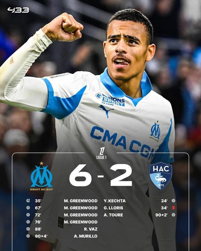 原本只是一场普通联赛,却被写进历史。马赛在主场6-2横扫勒阿弗尔,24岁的英格兰前锋梅森·格林伍德独中四元,成为马赛主场唯一的焦点。格林伍德在主场全面展示了自己的进攻武器库:点球、一脚触球破门、远射以及一次闪电般的配合进球,帮助马赛6-2横扫勒阿弗尔。