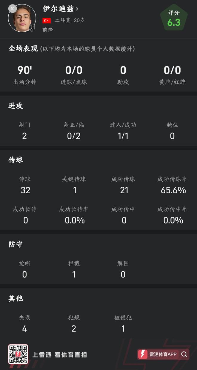 帕斯全场数据碾压伊尔迪兹:传射建功,关键传球51
