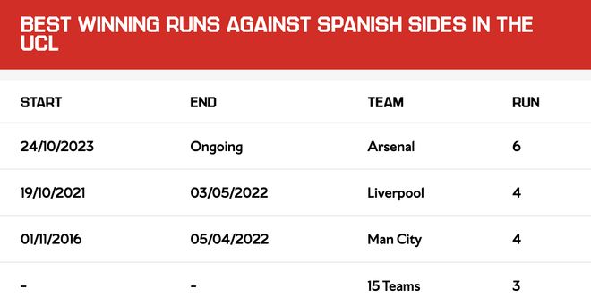 雷速体育10月20日讯 阿森纳俱乐部官网晒出的数据显示,过去6次面对西甲球队,阿森纳保持全胜,面对西班牙联赛球队胜率为41.9%。欧冠联赛第3轮,阿森纳将坐镇酋长球场与近期复苏势头明显的马德里竞技展开碰撞。根据统计,这将是2025年阿森纳第五次与来自西甲的球队进行较量,此前四次,阿森纳在与西甲球队的对决中保持全胜。如果将时间继续拉长,阿森纳在过去6次与西甲球队的比赛中保持全胜。而他们完全有可能继续扩大这一战果。在阿森纳之前,利物浦和曼城曾先后做到连续4次击败西甲球队。另有15支球队对西甲球队保持3连胜的记录。欧冠对西甲球队6连胜后,阿森纳对西甲球队的胜率已经超过40%,达到41.9%。如若此番击败马竞,阿森纳将第19次击败来自西班牙的球队。而西班牙也将正式成为阿森纳取胜次数最多的联赛国别。 附:阿森纳过去连续6次击败西甲球队的经历2023/24赛季欧冠联赛小组赛B组第三轮,塞维利亚1-2阿森纳;2023/24赛季欧冠联赛小组赛B组第四轮,阿森纳2-0塞维利亚;2024/25赛季欧冠联赛联赛阶段第8轮,赫罗纳1-2阿森纳;2024/25赛季欧冠联赛1/4决赛首回合,阿森纳3-0皇家马德里;2024/25赛季欧冠联赛1/4决赛次回合,皇家马德里1-2阿森纳;2025/26赛季欧冠联赛联赛阶段第一轮,毕尔巴鄂竞技0-2阿森纳。