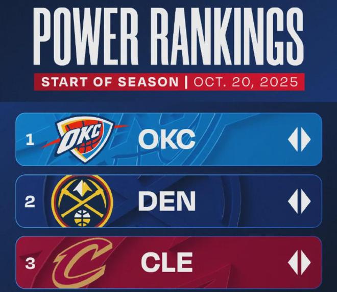 - NBA | 球队实力榜:雷霆高居榜首掘金位列次席