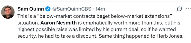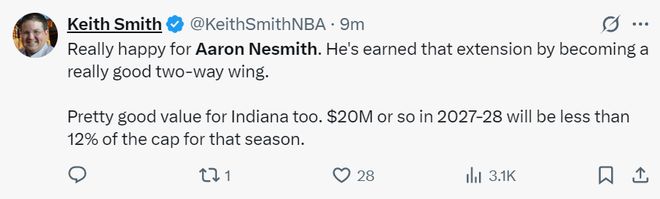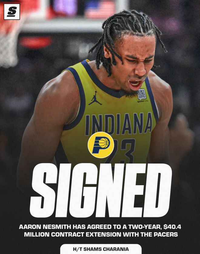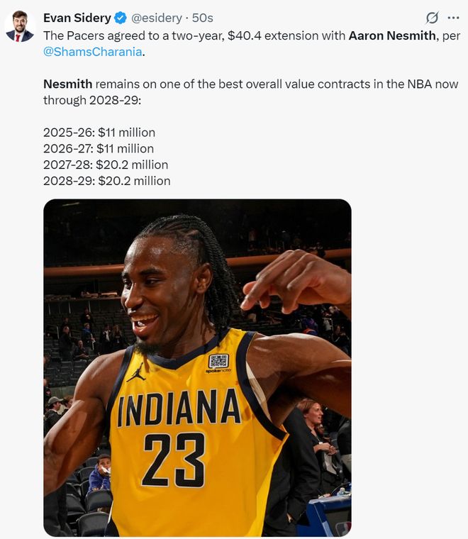 北京时间10月21日,根据ESPN的报道,印第安纳步行者与内史密斯达成提前续约协议,这份合同为两年4040万,均薪仅2020万,26岁的内史密斯在上赛季的表现非常不错,季后赛三分命中率高达49.2%,这是NBA球员季后赛出手至少100+三分最高的命中率。NBA记者埃文-斯迪瑞还晒出内史密斯双臂肌肉膨胀的图片来祝贺步行者,内史密斯不仅一年比一年出色,他在今夏还将自己练成魔鬼筋肉人,新赛季的他对抗会再度提升。上赛季常规赛内史密斯场均25分钟,拿到12分4篮板1.2助攻0.78抢断0.38盖帽,命中率50.7%,三分命中率43.1%,罚球命中率91.3%,进入180俱乐部。埃文-斯迪瑞也晒出了内史密斯的合同细节:25-26赛季1100万、26-27赛季1100万、27-28赛季2020万、28-29赛季2020万,他未来四年的薪水仅为6240万,均薪为1560万,对于这样的顶级3D来说步行者赢麻了。CBS记者萨姆-奎因评价内史密斯这笔续约:这种明显低于市场价的续约情况,阿龙-内史密斯的价值远远高于他跟步行者签下的两年4040万,但根据他现有的合同条款,他所能获得最大的加薪限度是有限的(低于工资帽12%),所以要保障自己的利益就只能接受一定的折扣。鹈鹕的赫伯特-琼斯也是类似的情况。肯尼-史密斯表示:真的为内史密斯感到感谢,他值得这笔续约合同,对于步行者来说这次续约也极具性价比,27-28赛季大约2000万连该赛季工资帽的12%都不到。
