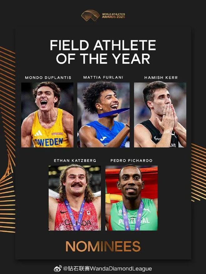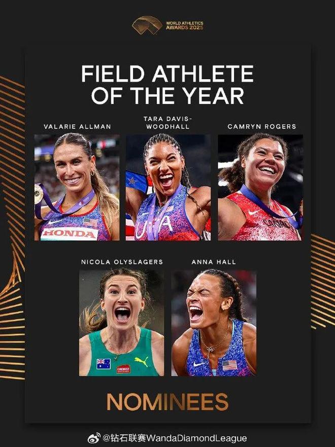 世界田联近日公布了2025年“世界最佳男子田赛运动员”的候选人名单:杜普兰蒂斯、弗拉尼、卡兹伯格、科尔、皮查多入选。杜普兰蒂斯(瑞典):世锦赛+室内世锦赛撑竿跳高冠军,今年4破世界纪录,保持不败,钻石联赛年度总冠军。弗拉尼(意大利):世锦赛+室内世锦赛跳远冠军,世界年度前3好成绩中占2个。卡兹伯格(加拿大):世锦赛链球冠军,创今年世界最佳84.70米(洲纪录),跻身为史上第五人。科尔(新西兰):世锦赛跳高冠军,室内世锦赛亚军,创今年世界最佳2.36米,平大洋洲纪录。皮查多(葡萄牙):世锦赛三级跳远冠军,创今年世界最佳17.91米。世界最佳女子田赛运动员候选公布:奥尔曼、戴维斯等5人入选
