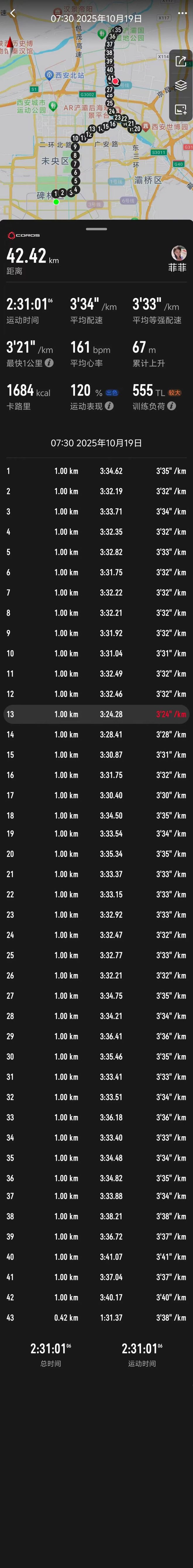而对于朱卿,这最后的8公里是一场关于放弃还是要再努力一下的拧巴之战。在34公里崩盘后她曾有几百米配速掉到了四分半,然后她又想办法追了点时间回去。整个就是掉了再提,提了再掉再提的速度拉锯。“其实维持四分以内的节奏也是维持到了39公里,到41公里前的2公里里,我的速度彻底掉到了四分出头。”