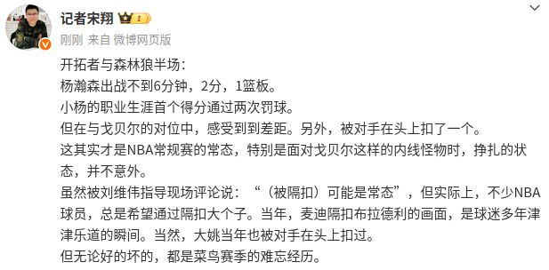 - NBA | 媒体人:杨瀚森首秀整体没给球队拖后腿,要从长远看他的发展