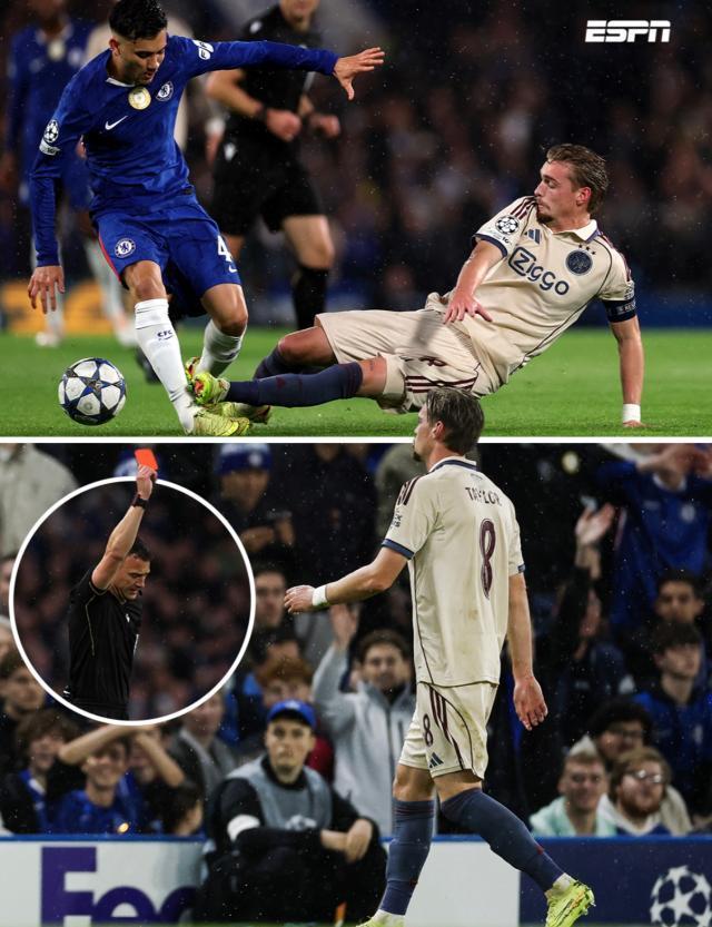 实际上,蓝军先发里充斥着不少在大赛中不被信任、经验匮乏的队员。所以比赛伊始,大众都有些看不太明白马雷斯卡的战略意图。而率先发难的也是阿贾克斯,让凯塞多继续客串右后卫、实则内收的策略,面对主队高效的纵向反击一度束手无策。但恰似季初对西汉姆那场5球大胜,不知道出于何种缘故,运气又一次眷顾了马雷斯卡。纵使被荷兰球迷百般诟病——技术不够细腻、选位时常有问题,但不妨碍队长肯内思·泰勒是眼下贾府队中前景最好、也最容易被卖上价的球员。然而在一次毫无必要阻拦的转换回合中,他以极为莽撞、不负责任的侧身飞铲放倒博纳诺特,被主裁茨瓦耶处以红牌极刑。