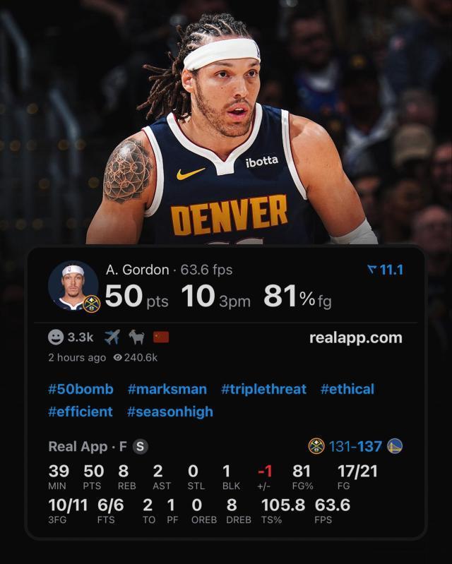就在亚历山大拿到NBA新赛季第一个50+后不到2小时,赛季第二个单场得分50+的表演到来,这位球员打出的数据定格在50分8篮板2助攻,运动战21投17中,三分11中10,罚球6中6。看向如此恐怖的三分准头,你可能下意识猜测打出这一数据的人是库里,但正确答案是:阿隆·戈登。北京时间10月24日,掘金迎来赛季揭幕战,他们客场挑战金州勇士。经历了一个加时赛的苦战,戈登拿到了创职业生涯纪录的50分(此前最高41分),他在三分线外的准星令人惊叹,上半场就7投7中,追平了NBA历史半场三分全中的命中纪录。最终全场打完,戈登的真实命中率为105.8%,超越凯瑞·欧文,成为了NBA历史单场真实命中率最高的50分先生。
