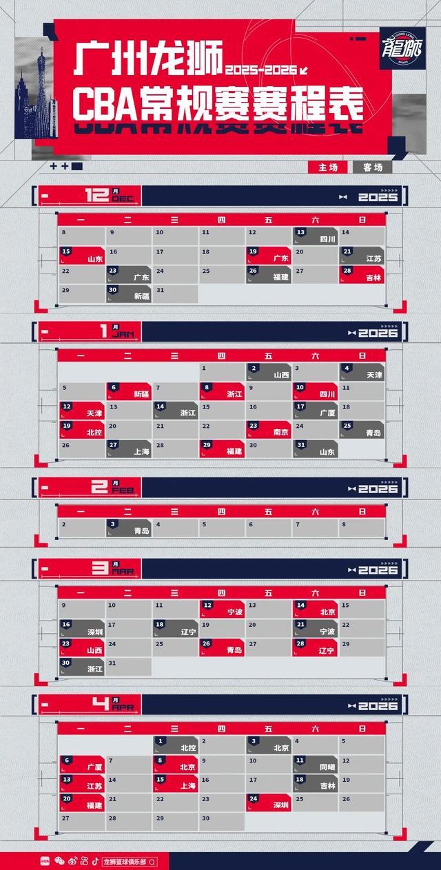 - CBA | 前行无畏广州龙狮20252026赛季CBA联赛常规赛赛程图