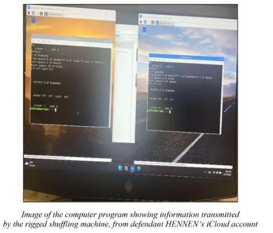 (可以看牌的定制APP)即使荷官在途中切牌,老千也只需在APP中输入他手里的两张底牌,或德扑流程中必然亮出的3张公共牌,APP就能自动计算出荷官在哪个位置切了牌,从而得知其他所有玩家的手牌。根据FBI和检察官的披露,黑手党们用的BUG基本完全一样,甚至更简单——他们没再费力搞什么微型计算机,干脆用的是改装过的Deckmate 2。起诉书中提到的一个案例很离谱,说一些黑手党甚至持枪抢劫了一台“加料版”的Deckmate 2,用于他们的杀猪盘......改装后的Deckmate 2会将所有人的手牌远程传给一个“操作员”,后者再将消息通过手机传给牌桌上的老千们(黑话叫“四分卫”、“司机”),接着领头的那个老千会给同伙打隐蔽的手势,告诉他们怎么玩,是下注还是弃牌。