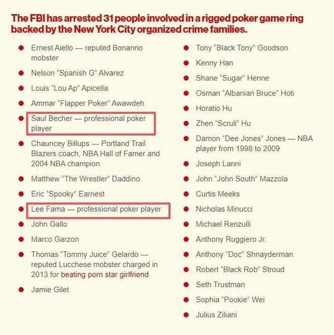 (逮捕名单)“人头牌”、高科技、职业选手...牌局被操控到这个份上,猪仔们死都不知道自己怎么死的。据说那些NBA明星充当“人头牌”之后,可以分得一部分“猪仔”的钱。有时候除了“猪仔”本人,牌桌上的每个人都是演员,每个人都假装有输有赢,但一定会把“猪仔”榨到输光为止。2023年夏天的一系列赌局,使得某位“猪仔”连输了180万美元,黑手党当然也不怕他赖账——人家可是黑手党。