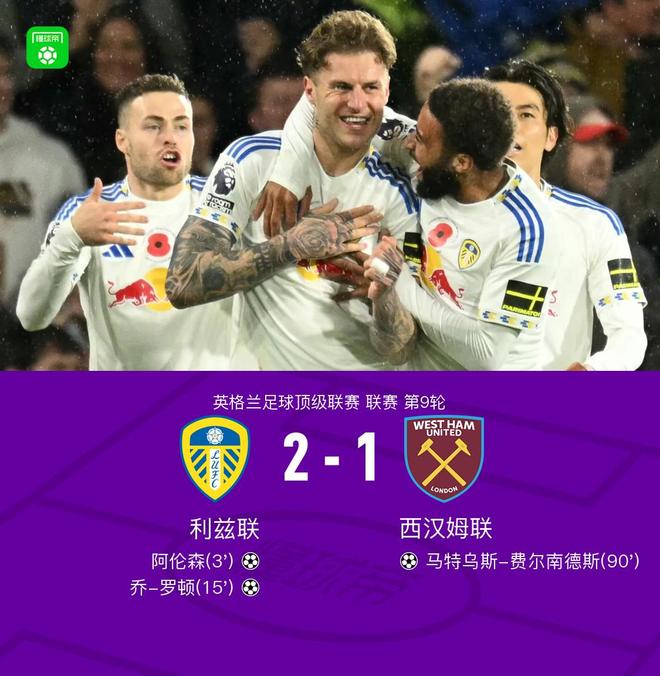 北京时间10月25日英格兰足球顶级联赛 联赛 第9轮,利兹联主场对阵西汉姆联。上半场,阿伦森闪击得分。随后,朗斯塔夫开出角球,乔-罗顿破门。下半场最后时刻,鲍恩传中,马特乌斯-费尔南德斯扳回一城。全场比赛结束,利兹联2-1战胜西汉姆联,铁锤帮则是遭遇英超连续6轮不胜。关键事件第4分钟,开场闪击,阿伦森补射建功,利兹联1-0
