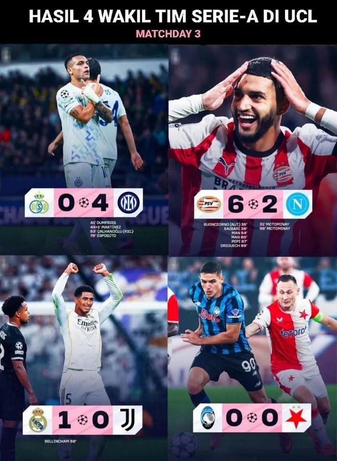 2023/24赛季,国米、那不勒斯和拉齐奥都以小组第二的身份出线,只有米兰排名第三降级打欧联。但是三支晋级球队却同时止步淘汰赛第一轮,国米跟马竞打到点球才分出胜负,那不勒斯和拉齐奥则分别被巴萨、拜仁两支豪强轻松击败。不过,这赛季的国米一早就明确了联赛夺冠的硬性任务,所以球队将士在联赛中投入的精力过多,影响了最终的欧冠成绩,好在最后如愿加冕了意甲第二颗星!2024/25赛季,才真是让我们深刻认识到了“国米踽踽独行”这句话!作为新欧冠开打的第一年,国米最终排名第4直接晋级十六强,而另外三支球队无一例外都入围附加赛。原本三队淘汰赛的对手都不算强,都有晋级可能,奈何最后都成了笑话!米兰不敌费耶诺德,尤文被埃因霍温淘汰,这两队输给荷甲球队还算说得过去,可亚特兰大两回合被比甲布鲁日5:2击败实在令人匪夷所思!而国米的表演才刚刚开始,在之后淘汰赛先后击败费耶诺德、拜仁和巴萨闯入决赛!虽然最终惨败给巴黎,但三年内两次打进欧冠决赛的战绩已经相当不易!