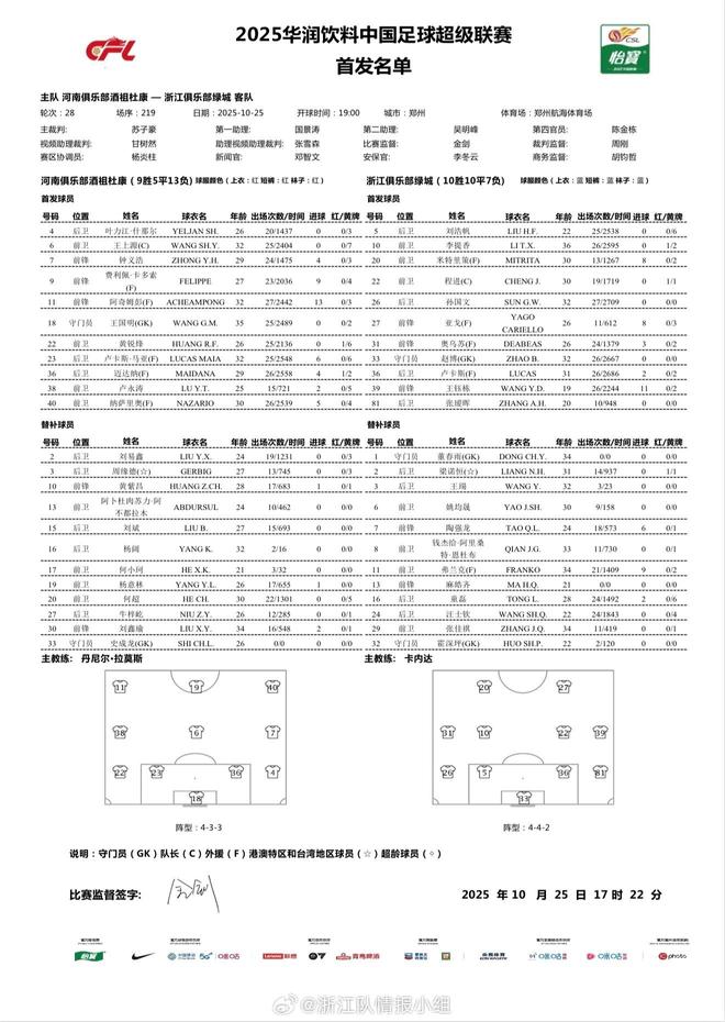 北京时间10月25日19:00,中超第28轮继续进行,河南坐镇郑州航海体育场迎战浙江,本场主裁判为苏子豪,VAR裁判为甘树然,赛前双方首发出炉。