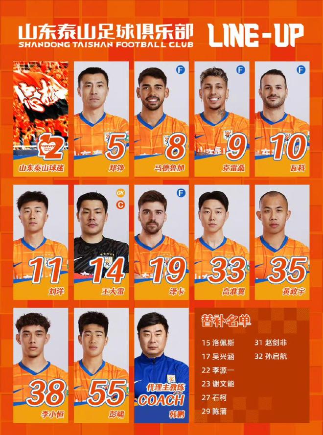 山东泰山首发:14-王大雷、5-郑铮、15-路易斯-洛佩斯(F)、11-刘洋、33-高准翼、35-黄政宇、8-马德鲁加(F)、19-泽卡(F)、38-李小恒、10-卡扎伊什维利(F)、9-克雷桑(F)上海海港首发:1-颜骏凌、4-王燊超、5-张琳芃、32-李帅、40-吾米提江-玉苏普、10-马特乌斯-维塔尔(F)、21-梅伦多(F)、22-马修斯-茹萨(F)、26-刘若钒、45-莱昂纳多(F)、49-李新翔开场仅仅8分钟,李新翔在一次反击中包抄打进,帮助上海海港1-0先下一城,后面的比赛,多次扛住山东泰山的进攻,第41分钟还是没有守住,也是被反击攻破了球门,泽卡突破送出助攻,卡扎伊什维利禁区低射破门。尽管山东泰山上半场在进攻端占优,但未能抓住机会反超比分。到了下半场,山东泰山利用主场优势持续冲击上海海港的后防线。第62分钟,泽卡带球晃过张琳芃送出横传,刘洋推射破门,帮助山东泰山2-1反超比分。第77分钟,克雷桑开出任意球,卡扎伊什维利凌空转身抽射破门,帮助山东泰山3-1扩大领先优势,这个比分也保持到比赛结束。