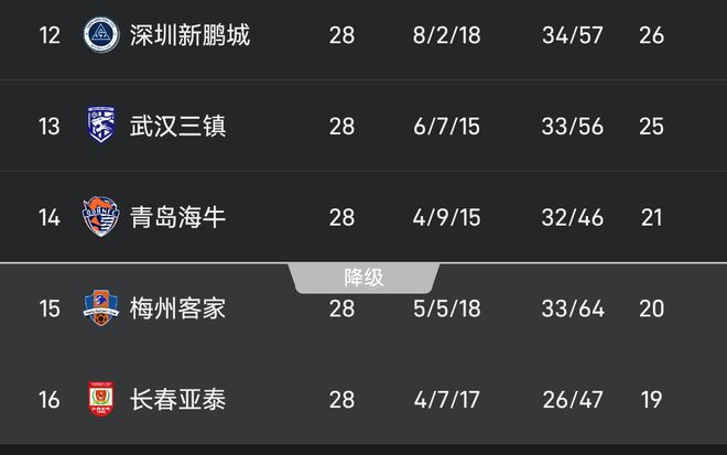 中超保级形势:海牛21分暂逃降级区,梅州20分、亚泰19分