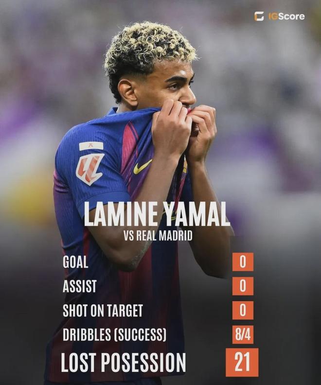 亚马尔毫无疑问是这场比赛的焦点,赛前,他与国家队老大哥卡瓦哈尔就爆发了口水战,本场国家德比,亚马尔的表现可以说完全不如姆巴佩,他全场一共只有2次射门,0次射正,丢失球权达到了21次,是全场最高。