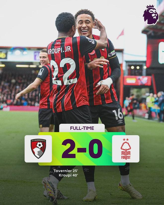 伯恩茅斯2-0 诺丁汉森林英超第9轮,伯恩茅斯主场迎战诺丁汉森林。上半场,塔韦尼耶角球直接破门,克鲁皮远射破门,最终,伯恩茅斯在主场2球击败对手。