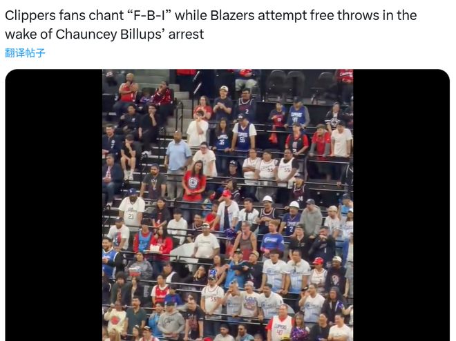 雷速体育10月27日讯 NBA常规赛继续进行,快船今天在主场迎战开拓者。NBA记者Ben Golliver晒出视频,当开拓者球员罚球时,快船主场球迷齐声喊:“FBI。”
