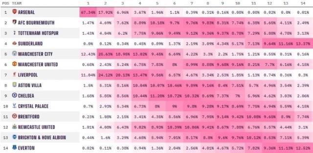 - 英超 | 赛博算卦:枪手英超夺冠概率超六成