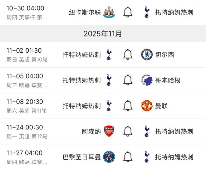 热刺接下来六场赛程:10月30日 04:00 纽卡斯尔联vs热刺(英联杯)11月2日 01:30 热刺vs切尔西(英超)11月5日 04:00 热刺vs哥本哈根(欧冠)11月8日 20:30 热刺vs曼联(英超)11月24日 00:30 阿森纳vs热刺(英超)11月27日 04:00 巴黎圣日尔曼vs热刺(欧冠)
