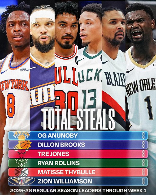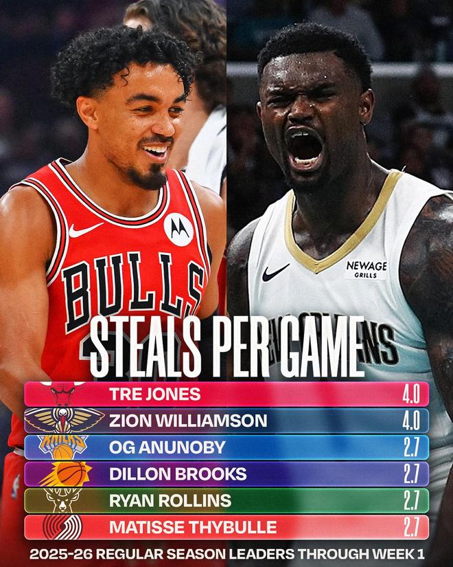 抢断总抢断榜OG-阿奴诺比 8狄龙-布鲁克斯 8特雷-琼斯 8莱恩-罗林斯 8赛布尔 8锡安-威廉森 8场均抢断榜特雷-琼斯 4.0锡安-威廉森 4.0OG-阿奴诺比 2.7狄龙-布鲁克斯 2.7莱恩-罗林斯 2.7赛布尔 2.7