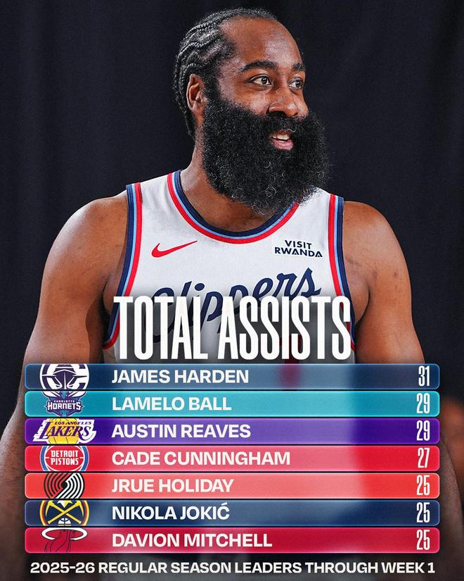助攻总助攻榜哈登 31拉梅洛-鲍尔 29里夫斯 29坎宁安 27朱-霍勒迪 25约基奇 25达维昂-米切尔 25场均助攻榜约基奇 12.5哈登 10.3拉梅洛-鲍尔 9.7里夫斯 9.7基扬特-乔治 9.5