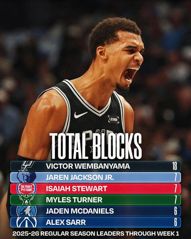 盖帽总盖帽榜文班亚马 18小贾伦-杰克逊 7斯图尔特 7迈尔斯-特纳 7杰登-麦克丹尼尔斯 6亚历克斯-萨尔 6场均盖帽榜文班亚马 6.0小贾伦-杰克逊 2.3斯图尔特 2.3迈尔斯-特纳 2.3凯斯勒 2.0杰登-麦克丹尼尔斯 2.0亚历克斯-萨尔 2.0