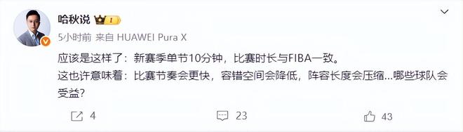- CBA | 媒体人:新赛季CBA单节10分钟,比赛时长与FIBA一致