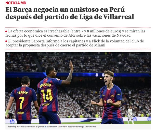 这是来自秘鲁的邀约,组织者希望巴萨能在12月份来秘鲁踢商业赛,开价700万-800万欧元。巴萨收到邀请,非常愿意前往秘鲁。用该报的话来说,这是“无法拒绝的丰厚收入”。巴萨主席拉波尔塔,与4大队长特尔施特根、阿劳霍、德容、拉菲尼亚,以及主帅弗里克、体育总监德科,在甘伯体育城商讨这件事。拉波尔塔告诉众人,他将接受邀请,这对俱乐部的财政有着促进作用。