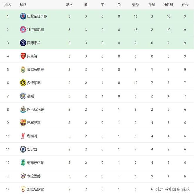 由于欧冠新规则只实施了一个赛季,数据很少,只能勉强用来参考。上赛季,欧冠第八名是阿斯顿维拉,有16个积分,第九名的亚特兰大只有15分,无缘晋级。不妨可以用16分这个分数,作为晋级的标准。上赛季的8支晋级球队中,第三轮过后,利物浦和阿斯顿维拉排名最高,都是三场全胜有9分,阿森纳、国际米兰和勒沃库森都是2胜1平有7分,巴塞罗那和里尔都是2胜1负有6分,马德里竞技最特别,前三场只赢一场,最后5场全胜,成功挤进前八名,多输1场都不行。可见,前八名的球队中,除了马竞这个特例之外,有7支球队在第三轮的时候,至少都得到6分,这样的话,拿到16分的机会更高一些。因此,可以初步判断,这个赛季最终进入欧冠前八名的球队中,大部分现在都应该有6分。简单起见,看看一共14支6分以上的球队,晋级形势到底是怎样的。