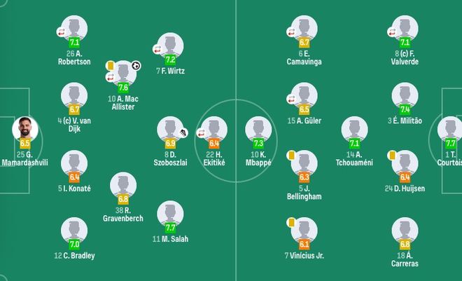 【出场阵容】利物浦首发:25-马马尔达什维利、12-布拉德利、4-范戴克、5-科纳特、26-罗伯逊(886-科尔克兹)、38-赫拉芬贝赫、8-索博斯洛伊、10-麦卡利斯特(69'17-琼斯)、11-萨拉赫、22-埃基蒂克(69'18-加克波)、7-维尔茨(88'14-基耶萨)替补未出场:28-伍德曼、74-米斯丘尔、2-戈麦斯、3-远藤航、73-恩古莫哈皇马首发:1-库尔图瓦、8-巴尔韦德(90'21-迪亚斯)、3-米利唐、24-赫伊森、18-卡雷拉斯、14-楚阿梅尼、6-卡马文加(69'11-罗德里戈)、15-居莱尔(81'12-阿诺德)、5-贝林厄姆、7-维尼修斯、10-姆巴佩替补未出场:13-卢宁、26-弗兰-冈萨雷斯、9-恩德里克、16-贡萨洛、17-阿森西奥、19-塞瓦略斯、20-弗兰-加西亚、23-费兰-门迪