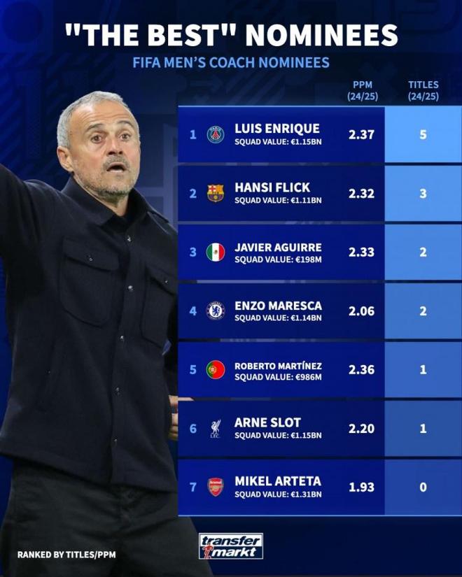 德转列最佳教练候选上赛季成绩:恩里克(巴黎圣日耳曼)球队身价——11.5亿欧,场均积分——2.37,冠军——法甲、法国杯、法国超级杯、欧冠、欧超杯弗里克(巴萨)球队身价——11.1亿欧,场均积分——2.32,冠军——西甲、国王杯、西超杯马雷斯卡(切尔西)球队身价——11.4亿欧,场均积分——2.06,冠军——欧协联、世俱杯斯洛特(利物浦)球队身价——11.5亿欧,场均积分——2.20,冠军——英超阿尔特塔(阿森纳)球队身价——13.1亿欧,场均积分——1.93,冠军——无消息来源:德国转会市场3 - 凯塞多真出色马雷斯卡就靠他切尔西中场凯塞多本赛季在攻防两端的表现相当出色,甚至有媒体人称之为世界第一中场的。