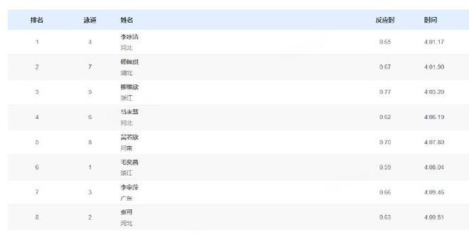 11月10日,全运会游泳女子400米自由泳:河北选手李冰洁夺得金牌,成绩为4:01.17,杨佩琪4:01.90收获银牌,柳雅欣4:03.20获得铜牌。