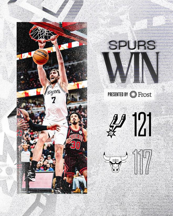 许尔特外线命中,为芝加哥稳住局面,卡斯尔打板得分,琼斯跳投打进,卡斯尔助攻科内特暴扣还以颜色。武切维奇连续单打不中,福克斯外线不进,卡斯尔抢断,随后2罚全中。比赛进入白热化阶段,琼斯抛投得分,卡斯尔被封盖,科内特2罚全中。道苏姆轰进远投,卡斯尔助攻科内特空接暴扣予以回应。道苏姆单打不进,文班亚马轰进追身远投,马刺追平比分。文班亚马大帽琼斯,随后单打命中三分球,距离终场仅剩27秒,公牛队请求暂停。许尔特外线打铁,卡斯尔抢下篮板被犯规,随后2罚全中,马刺领先5分得以锁定胜局。许尔特2罚1中,文班亚马2罚全中,道苏姆上篮得分,比赛时间走完。最终,马刺以121比117险胜公牛,得以上演13分逆转。圣安东尼奥实现了3连胜,继续排名西部第2。两队数据公牛队,武切维奇14中4,三分球5中3得到11分8板6助,在攻防两端杯文班亚马打爆。许尔特14中8,三分球9中4得到23分5板5助、特雷·琼斯15中8贡献20分7板7助2断、道苏姆12中6贡献20分2板5助2断、布泽利斯15分5板、史密斯13中5得到11分12板2助、卡特6分1板1助、威廉姆斯5分2板4断、特里4分、奥科罗5中0得到2分2板3助。马刺逆转公牛